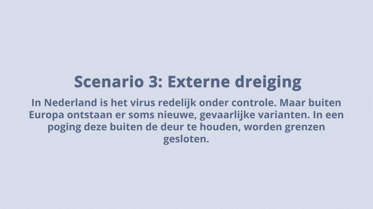 Beeldtekst: Scenario 3: Externe dreiging – in Nederland is het virus redelijk onder controle. Maar buiten Europa ontstaan er soms nieuwe, gevaarlijke varianten. In een poging deze buiten de deur te houden, worden grenzen gesloten.